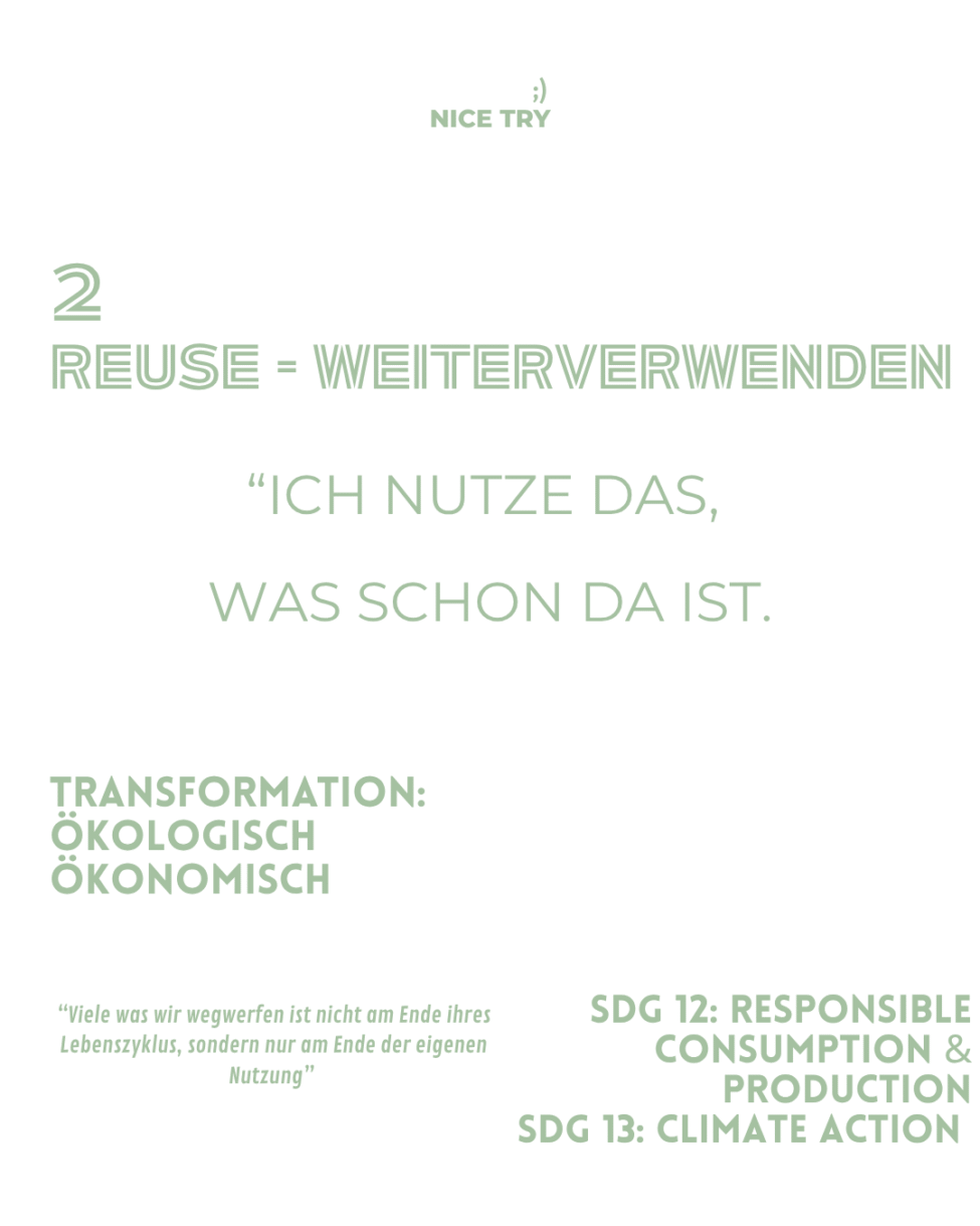 Gleichzeitig berührt sie auch SDG 9 (Industry, Innovation and Infrastructure), da Reuse nur dort möglich wird, wo Produkte, Systeme und Angebote entsprechend gestaltet sind. Denn je länger Produkte genutzt werden, desto geringer ist ihre Umweltwirkung.
